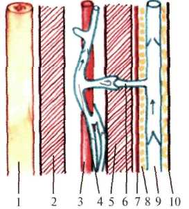 Подошвенные межкостные мышцы (mm. interossei plantares) заключены межкостной фасцией в отдельном ложе. На подошвенной поверхности стопы выделяют две борозды, в которых располагаются сосуды и нервы. Медиальная (sul. plantaris medialis) ограничена коротким сгибателем пальцев и мышцами I пальца. Латеральная борозда (sul. plantaris lateralis) находится между коротким сгибателем пальцев и мышцами мизинца. Подошвенные сосуды и нервы из лодыжкового канала спускаются вниз на подошву между пяточной костью и мышцей, отводящей I палец – в пяточном канале. Затем медиальные подошвенные сосуды и нерв направляются в медиальную подошвенную борозду, а латеральные подошвенные сосуды и нерв сначала располагаются в срединном ложе между коротким сгибателем пальцев и квадратной мышцей подошвы, потом проходят в латеральну подошвенную борозду и на уровне головок плюсневых костей латеральная подошвенная артерия возвращается в срединное ложе, где, анастомозируя с глубокой подошвенной ветьвю из дорсальной артерии стопы, участвует в образовании подошвенной дуги (arcus plantaris). От подошвенной дуги отходят подошвенные плюсневые артерии (aa. metatarseae plantares), которые дают общие подошвенные пальцевые артерии (aa. digitales plantares communes) и прободающие ветви (rr. perforantes). Последние анастомозируют с артериями тыльной поверхности стопы (рис.8.26). Подошвенные нервы, кроме иннервации кожи, осуществляют иннервацию мышц подошвенной поверхности стопы. Таким образом, на подошве четыре фасциальных футляра: медиальный, латеральный, срединный и ложе межкостных мышц. Медиальный и латеральный футляры более замкнутые, а срединный футляр по ходу сосудов и червеобразных мышц сообщается с клетчаткой тыльной поверхности стопы и более широко – с глубокой клетчаткой задней поверхности голени через пяточный и лодыжковый каналы. Срединное ложе разделено на два отдела листком фасции (глубокой фасции подошвы), проходящим между коротким сгибателем пальцев и квадратной мышцей подошвы. Поверхностное пространство содержит короткий сгибатель пальцев, глубокое пространство – все остальные мышцы срединного ложа и оба сосудисто-нервных пучка подошвы. Глубокое пространство срединного ложа называют подошвенным каналом (canalis plantaris). Канал ограничен: с боков – двумя перегородками, идущими от апоневроза в глубину, снизу (с поверхности) – глубокой фасцией подошвы, сверху – длинной связкой подошвы. Он проксимально продолжается в пяточный канал, затем следует лодыжковый канал, который сообщается с глубоким ложем задней поверхности голени. Мелкие лимфатические сосуды и вены с подошвы переходят на тыл стопы, где формируются коллекторные пути лимфооттока. Поэтому при воспалительных процессах на подошвенной поверхности наблюдается отек на тыле стопы.