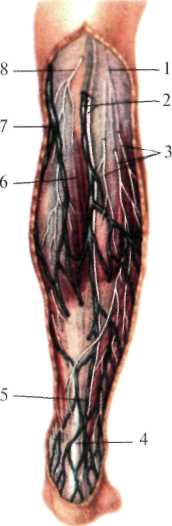 Задняя область (reg. cruris posterior). Кожа тонкая, легко смещается, иннервируется латеральным и медиальным кожными нервами голени. Подкожная клетчатка рыхлая, ее количество вариабельно. В клетчатке проходят малая подкожная вена ноги и кожные нервы. Малая подкожная вена в нижней трети голени лежит в подкожной клетчатке вместе с икроножным нервом (n. suralis), который представляет собой соединение медиального и латерального кожных нервов голени. В средней трети вена прободает собственную фасцию и располагается в толще ее (канал Пирогова), а в верхней трети лежит под собственной фасцией, между головками икроножной мышцы, вместе с медиальным кожным нервом голени (рис.8.21).
