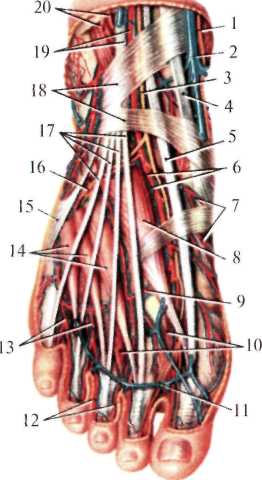 Передний фасциальный футляр ограничен изнутри большеберцовой костью, спереди – фасцией голени, снаружи – передней межмышечной перегородкой, сзади – межкостной мембраной голени (membrana interossea cruris). В переднем фасциальном футляре расположены три мышцы: передняя большеберцовая (m. tibialis anterior) лежит внутри, длинный разгибатель пальцев (m. extensor digitorum longus) – снаружи, между ними и только в нижней половине голени – длинный разгибатель I пальца (m. extensor hallucis longus). Передняя большеберцовая мышца начинается от латеральной поверхности большеберцовой кости, межкостной мембраны и фасции голени; длинный разгибатель пальцев – от обеих костей голени, передней межмышечной перегородки и фасции; длинный разгибатель I пальца – от малоберцовой кости и межкостной мембраны. Стенками латерального фасциального футляра служат: спереди и сзади – межмышечные перегородки, снаружи – собственная фасция, изнутри – малоберцовая кость. В латеральном фасциальном футляре находятся длинная и короткая малоберцовая мышцы. Длинная малоберцовая мышца (m. peroneus longus) расположена более поверхностно, начинается двумя частями – от боковой поверхности верхней трети малоберцовой кости и ее головки, а также от обеих межмышечных перегородок и фасции голени. На середине голени мышца переходит в сухожилие, которое спускается вниз сначала кнаружи от короткой малоберцовой мышцы, а затем позади нее, огибает сзади наружную лодыжку, пересекает косо подошвенную поверхность стопы и прикрепляется на ее медиальном крае к медиальной клиновидной (os cuneiforme mediale) и I плюсневой (os metatarsea I) костям. Короткая малоберцовая мышца (m. peroneus brevis) берет начало от средней трети наружной поверхности малоберцовой кости и обеих межмышечных перегородок, прикрепляется у латерального края стопы к бугристости V плюсневой кости (tuberositas ossis metatarsalis V). В ложе латеральных мышц из подколенной ямки проникает общий малоберцовый нерв. Он проходит между двумя головками длинной малоберцовой мышцы и шейкой малоберцовой кости, непосредственно прилегая к последней. При оперативных вмешательствах на малоберцовой кости к ее головке подходить следует поднадкостнично во избежание повреждения нерва. Здесь нерв дает много мышечных ветвей, образуя гусиную лапку, и делится на две длинные ветви: поверхностный малоберцовый и глубокий малоберцовый нерв. Поверхностный малоберцовый нерв спускается вниз между малоберцовой костью и длинной малоберцовой мышцей – верхний мышечно-малоберцовый канал (canalis musculoperoneus superior), затем проходит между длинной и короткой малоберцовыми мышцами. Отдав к ним ветви, нерв на границе средней и нижней трети прободает собственную фасцию, выходит в подкожную клетчатку и становится кожным нервом. Глубокий малоберцовый нерв прободает переднюю межмышечную перегородку и переходит в ложе передних мышц, располагаясь глубоко – на межкостной мембране между передней большеберцовой мышцей и длинным разгибателем пальцев, а в нижней половине – между передней большеберцовой мышцей и длинным разгибателем I пальца. Вместе с глубоким малоберцовым нервом проходит передняя большеберцовая артерия (a. tibialis anterior) с двумя сопровождающими ее венами (рис.8.20). Артерия является ветвью подколенной артерии и выходит на переднюю поверхность голени из голено-подколенного канала (canalis cruropopliteus) через отверстие в межкостной 