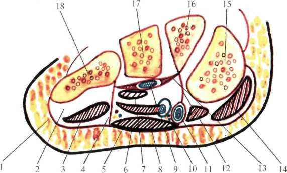 Собственная фасция голени является продолжением подколенной фасции. На задней поверхности голени от нее отделяется глубокая пластинка (lamina profunda fasciae cruris), которая разделяет мышцы на два слоя – поверхностный и глубокий. Поверхностный слой представлен икроножной (m. gastrocnemius), подошвенной (m. plantaris) и камбаловидной (m. soleus) мышцами. Икроножная мышца начинается двумя головками от бедренной кости над соответствующими мыщелками бедра. На середине голени соединенные ее головки переходят в сухожилие, которое, слившись с сухожилием камбаловидной мышцы в одно массивное пяточное (ахиллово) сухожилие (tendo calcaneus - Achillis), прикрепляется к задней поверхности бугра пяточной кости (tuber calcanei). Глубже икроножной мышцы проходит тонкая подошвенная мышца, которая начинается на бедренной кости выше латерального мыщелка, прикрепляется к пяточному бугру (может и отсутствовать). Еще глубже лежит камбаловидная мышца, начало которой сухожильной дугой (arcus tendineus) перекидывается от головки малоберцовой кости к линии камбаловидной мышцы (linea m. solei) на большеберцовой кости. Кроме того, камбаловидная мышца начинается от задней поверхности верхней трети малоберцовой кости и средней трети большеберцовой. Волокна мышцы, спускаясь вниз, переходят в широкое сухожильное растяжение, которое суживается дистально и сливается с сухожилием икроножной мышцы. Камбаловидная и икроножная мышцы, соединенные одним общим ахилловым сухожилием, называются трехглавой мышцей голени (m. triceps surae). Выше начальной части камбаловидной мышцы располагается подколенная мышца (m. popliteus), которая начинается на латеральном надмыщелке бедра и от сумки коленного сустава, прикрепляется к задней поверхности большеберцовой кости выше линии камбаловидной мышцы. Между подколенной мышцей и сухожильной дугой камбаловидной мышцы проходит сосудисто-нервный пучок из подколенной ямки на заднюю поверхность голени. Сзади сосудисто-нервный пучок на этом участке закрыт головками икроножной мышцы. Поверхностные мышцы отделяются от второго мышечного слоя глубокой пластинкой собственной фасции, которая лучше выражена в нижних отделах голени. Глубокий слой мышц составляют: задняя большеберцовая мышца (m.tibialis posterior) – лежит посредине на межкостной мембране, длинный сгибатель I пальца (m. flexor hallucis longus) – находится снаружи, закрывает малоберцовую кость и длинный сгибатель пальцев (m. flexor digitorum longus) – располагается изнутри. Все мышцы начинаются на костях голени и межкостной мембране. Между поверхностным и глубоким слоями мышц в голено-подколенном канале (canalis cruropopliteus - Gruberi) проходит сосудисто-нервный пучок, состоящий из задней большеберцовой артерии (a. tibialis posterior) с двумя венами и большеберцового нерва (n. tibialis) (рис.8.22). Нерв располагается снаружи и сзади от артерии на всем протяжении голени. Проекция для обнажения сосудисто-нервного пучка производится по линии, находящейся кверху на один поперечный палец кзади от медиального края большеберцовой кости, внизу – на уровне середины расстояния между медиальной лодыжкой и ахилловым сухожилием. Голено-подколенный канал имеет четыре стенки и три отверстия. Стенки: передняя – задняя большеберцовая мышца, задняя – камбаловидная мышца (точнее – глубокая пластинка собственной фасции голени), наружная – длинный сгибатель I пальца, внутренняя – длинный сгибатель па