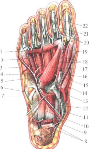 Подошва (plantar pedis). Кожа толстая, грубая, не смещается, так как сращена с глубжележащим апоневрозом. Иннервируется ветвями подошвенных нервов, причем медиальный подошвенный нерв иннервирует кожу I-IV пальцев, а латеральный подошвенный нерв – IV, V пальцев. Подкожная клетчатка плотная, дольчатая, пронизана сухожильными перемычками, соединяющими кожу с апоневрозом. Особенно много клетчатки в местах опоры – на пяточной кости и головках плюсневых костей. Подошвенный апоневроз (aponeurosis plantaris) представляет собой мощный сухожильный пласт, идущий от пяточной кости к основаниям пальцев, имеет треугольную форму и не закрывает всей подошвенной поверхности. На мышцы I и V пальцев переходит фасция, являющаяся продолжением подошвенного апоневроза. В апоневрозе, в особенности в дистальной части, есть много отверстий, пропускающих сосуды и нервы и связывающих таким образом подкожную клетчатку с глубокой. От подошвенного апоневроза к межкостной фасции отходят две перегородки. Они разделяют все пространство, находящееся глубже апоневроза, на три отдела: ложе мышц I пальца – медиальное, ложе мышц V пальца – латеральное и срединное ложе (рис.8.25). Медиальная группа мышц состоит из отводящей I палец (m. abductor hallucis), короткого сгибателя I пальца (m. flexor hallucis brevis) и сухожилия длинного сгибателя I пальца. В латеральную группу входят: мышца, отводящая мизинец (m. abductor digiti minimi), сгибатель его (m. flexor digiti minimi) и мышца, противопоставляющая V палец (m. opponens digiti minimi). В срединном ложе сразу за апоневрозом находится короткий сгибатель пальцев (m. flexor digitorum brevis), затем квадратная мышца подошвы (m. quadratus plantae) и сухожилия длинного сгибателя пальцев с начинающимися от них червеобразными мышцами (mm. lumbricales). Глубже располагаются косая и поперечная головки (caput obliquum et caput transversum) мышцы, приводящей I палец (m. adductor hallucis), и сухожилие длинной малоберцовой мышцы, косо пересекающее подошву в толще длинной подошвенной связки (lig. plantare longum) и прикрепляющееся к медиальной клиновидной и первой плюсневой костям.