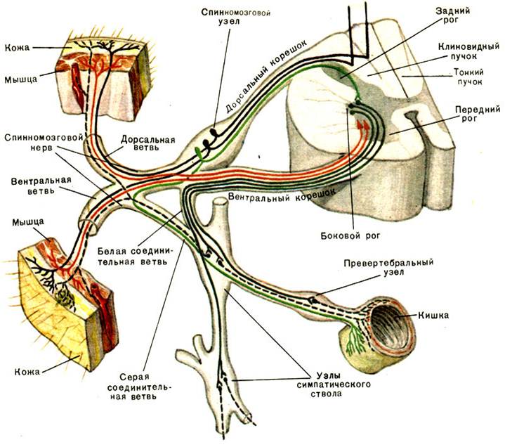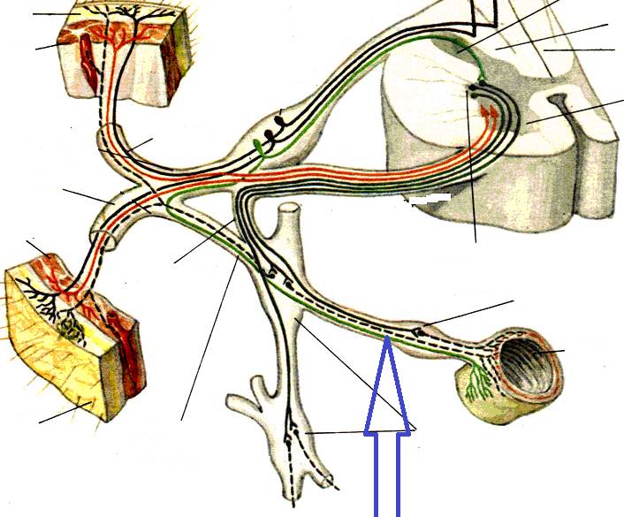 -: задний рог -: передний рог +: спинномозговой узел -: боковой рог -: симпатический ствол