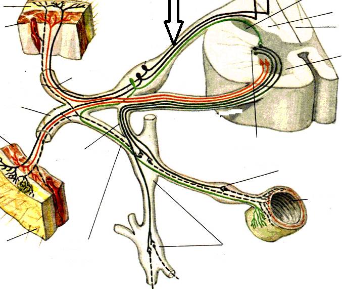 -: чувствительное волокно -: двигательное волокно +:серую соединительную ветвь -: белое соединительное волокно -: симпатический ствол