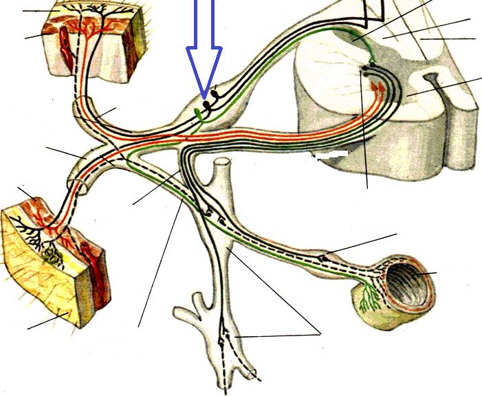 -: задний рог -: передний рог +: предузловое волокно -: послеузловое волокно -: симпатический ствол
