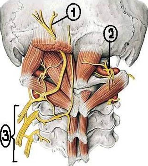+: rr. dorsales nervi occipitales -: n. suboccipitalis -: n. occipitalis major -: n. occipitalis minor