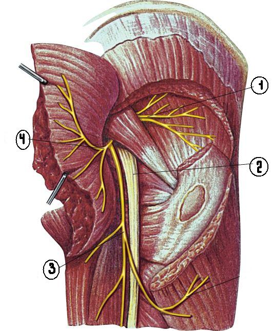 +: axillaris -: cutaneus brachii posterior -: cutaneus antebrachii posterior -: radialis -: subscapularis -: dorsalis scapulae -: suprascapularis I: S: Цифра 4 указывает на ветвь плечевого сплетения n. ….