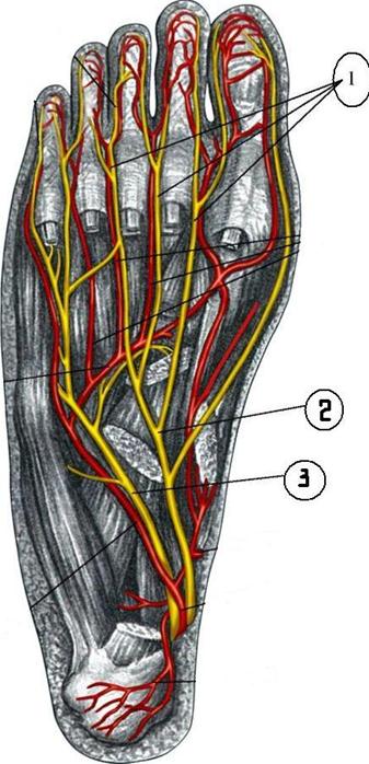 +: plantaris lateralis -: digitales plantares proprii -: plantaris medialis