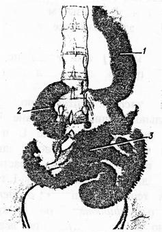 Анатомия. Развивается из средней части кишки, простирается от привратника до прямой кишки, длиной 2,7 м. Имеет большое количество поперечных складок. Разделяется на 12-типерстную, тощую и подвздошную кишку. 12-типерстная кишка - участок от привратника до дуодено-еюнального сфинктера, длиной 25-З0 см. Тощая кишка - средняя часть тонкой кишки (15) длиной 2,5 м, имеет большой диаметр, толстую стенку за счет спиралевидных мышечных волокон, более богато снабжена сосудами. Подвздошная кишка - конечная часть. рентгенологические критерии 12-типерстная кишка имеет вид треугольника, обращенного основанием к привратнику, слизистая верхней части имеет продольные складки, а нижней - циркулярные, тощая и подвздошная кишки имеют перистую форму за счет поперечных складок, участки спазма проявляются продольными и косыми складками.