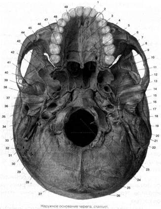 Рис. 17. Наружное основание черепа. 1. Резцовое отверстие, foramen incisivum. 2. Носовой гребень, crista nasalis. 3. Верхняя челюсть, небный отросток, maxilla, processuspalatinus. 4. Поперечный небный шов, sutura palatina transversa. 5. Небная кость, горизонтальная пластинка, os palatinum, lamina horizon-talis. 6. Большое небное отверстие, foramen palatinum majus. 7. Нижняя глазничная щель, fissura orbitalis inferior. 8. Дуга скуловой кости, arcus zygomaticus. 9. Крыловидный отросток клиновидной кости, ossis sphenoidalis, processus pterygoideus. 10. Подвисочный гребень, crista infratemporalis. 11. Сошник, vomer. 12. Овальное отверстие, foramen ovale. 13. Остистое отверстие, foramen spinosum. 14. Глоточный бугорок, tuberculum pharyngeum. 15. Сонный канал, canalis caroticus. 16. Сосцевидный каналец, canaliculus mastoideus. 17. Яремная ямка, fossa jugularis. 18. Шилососцевидное отверстие, foramen stylomastoideum. 19. Затылочно-сосцевидный шов, sutura occipitomastoidea. 20. Сосцевидный отросток, processus mastoideus. 21. Сосцевидная вырезка, incisura mastoidea. 22. Подъязычный канал, canalis hypoglossi. 23. Мыщелковый канал, canalis condylaris. 24. Большое отверстие, foramen magnum. 25. Нижняя выйная линия, linea nuchae inferior. 26. Наружный затылочный выступ, protuberantia occipitalis externus. 27. Верхняя выйная линия, linea nuchae superior. 28. Мыщелковый канал, canalis condylaris. 29. Затылочный мышелок, condylus occipitalis. 30. Каменистая ямочка, fossula petrosa. 31. Сосцевидное отверстие, foramen mastoideum. 32. Теменная кость, osparietale. 33. Яремное отверстие, foramen jugulare. 34. Яремная ямка, fossa jugularis. 35. Наружный слуховой проход, meatus acusticus externus. 36. Шиловидный отросток, processus styloideus. 37. Ость клиновидной кости, spina ossis sphenoidalis. 38. Нижнечелюстная ямка, fossa mandibularis. 39. Суставной бугорок, tuberculum articulare. 40. Рваное отверстие, foramen lacerum. 41. Скуловой отросток височной кости, processus zygomaticus, ossis temporalis. 42. Клиновидная кость, большое крыло, os sphenoidale, ala major. 43. Латеральная пластинка крыловидного отростка, lamina lateralis processus pterygoidei. 44. Медиальная пластинка крыловидного отростка, lamina medialis processus pterygoidei. 45. Крыловидный крючок, hamulus pterygoideus. 46. Скуловой отросток верхней челюсти, maxillae, processus zygomaticusi. 47. Пирамидальный отросток небной кости, processus pyramidalis ossis palatini. 48. Крыловидный отросток клиновидной кости, processus pterygoideus ossis sphenoidalis. 49. Задняя носовая ость, spina nasalis posterior