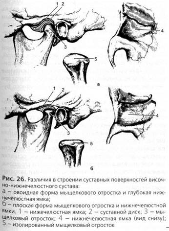 Головка нижней челюсти – валикообразное утолщение эллипсовидной формы, вытянутое в поперечном направлении. Оси, продолженные по длиннику головки, конвергируют у переднего края большого затылочного отверстия, образуя тупой угол. Спереди головки, в крыловидной ямке, прикрепляется латеральная крыловидная мышца. Задняя поверхность головки слегка выпуклая, треугольной формы, с основанием, обращенным вверх. Суставная поверхность нижнечелюстной ямки в 2-3 раза больше головки нижней челюсти. Она имеет эллипсовидную форму. Ямка делится на две части: переднюю – внутрикапсулярную, и заднюю – внекапсулярную. Инконгруэнтность между головкой и ямкой выравнивается за счет суставного диска и прикрепления капсулы сустава на височной кости. Внутрикапсулярная часть суставной ямки спереди ограничена скатом суставного бугорка, сзади - каменисто-барабанной щелью. Снаружи ямка ограничена корнем скулового отростка, изнутри – угловой остью клиновидной кости. Форма нижнечелюстной ямки различна и зависит от индивидуальных факторов развития, а также характера зубной окклюзии. Выделяют две крайние формы - глубокую и плоскую. Одна из характерных особенностей височно-нижнечелюстного сустава - наличие суставного бугорка, который присущ только человеку. Суставной бугорок, ограничивающий ямку спереди, представляет собой костное возвышение скулового отростка.