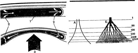 Рис. 65. Схема влияния мышечных сокращений на движение крови в венах: вверху — при расслабленной мышце, внизу — при сокращении; / — вена; 2 — венозные клапаны; S — давление сократившейся мышцы на вену; белые стрелки — движение крови в вене. Рис. 66. Изменение ширины русла (А) в связи с разветвлением (Б) сосудистой системы. Л — схема ширины русла: Б — схема ветвления сосудов. Цифры справа показывают увеличение количества сосудов. го русла приходится всего лишь 0,5 мл в 1 минуту. Если принять во внимание чрезвычайно малый диаметр каждого капилляра (чаще всего 5—10 микрон), то нетрудно подсчитать, что на прохождение через него 1 куб. мм крови потребуется несколько часов. Медленное течение крови по капиллярам облегчает переход кислорода и питательных веществ из крови в тканевую лимфу, а углекислоты и других продуктов обмена в обратном направлении—из лимфы в кровь. По пути от капилляров к предсердию кровеносное русло постепенно суживается и скорость течения крови увеличивается.. Кровяное давление у детей. В течение всей жизни в строении сосудистой системы происходят весьма значительные изменения. У новорожденного стенки артерий очень тонки, почти не содержат мышечных волокон, но богаты эластическими волокнами. Диаметр артерий, особенно крупных, относительно велик и мало отличается от диаметра соответствующих вен, а потому примерно одинакова емкость артериального и венозного русла. Мелкие сосуды и капилляры относительно широки и расположены очень густо. Перечисленные особенности облегчают движение крови по сосудам. Поэтому сердце новорожденного работает с меньшим напряжением: систолическое давление — 70—75 мм Hg. В первые месяцы жизни особенно широки сосуды верхней половины тела, которая, следовательно, получает больше крови. К началу второго года жизни, в связи с усиленным ростом нижних конечностей и началом ходьбы, диаметр сосудов нижней половины тела увеличивается. Появлением значительной подвижности, требующей доставки большего количества крови, объясняется увеличение ширины просвета сосудов и толщины их стенок у детей 6 А. И. Кабанов 2—3 лет. В частности, увеличивается количество гладких мышечные волокон в стенке артерий. Изменения, происходящие в сосудистой системе, связаны с ростом, развитием и деятельностью отдельных органов. Сосуды не только растут в длину и в толщину — появляются и новые мелкие кровеносные сосуды. Наряду с этим просветы некоторых сосудов зарастают, стенки их перерождаются. Таким образом происходит перераспределение сосудистой сети. Особенно легко разрушаются и заменяются новыми капилляры и мельчайшие артерии. К концу первого года жизни, в связи с интенсивным ростом тела и увеличением сосудистой системы, кровяное давление возрастает до 80—85 мм Hg. В последующие годы систолическое давление изменяется очень медленно, достигая к 10—12-летнему возрасту 90—100 лш Hg.