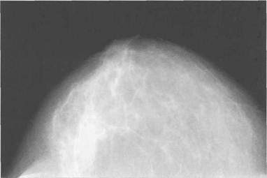 Рис. 10.10. Маммограмма Пациентка П., 34 года. Молочная железа с хорошо выраженной железистой тканью и замещением части железистых долек жировой тканью.
