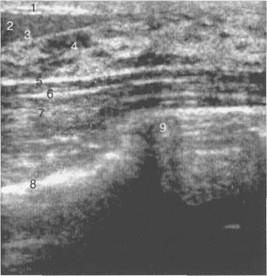 При эхографии оцениваются все Правая молочная железа Левая молочная железа структуры молочной железы: сосок, кожа, премаммарная жировая клетчатка, связки Купера, паренхима железы, млечные протоки, ретромаммарная область, зоны регионарного лимфооттока (рис. 10.17). Кожа на эхограмме представлена ровной гиперэхогенной линией толщиной 1,0—5,0 мм (см. рис. 10.7). У женщин пожилого возраста кожа приобретает трехслойную структуру и визуализируется в виде двух гиперэхогенных линий, разделенных тонкой гипоэхогенной прослойкой. Изменения контуров и толщины кожных покровов сопровождает воспалительные, рубцовые и опухолевые процессы. Сосок на эхограмме визуализируется как округлое, хорошо отграниченное образование средней или низкой эхогенности (рис. 10.18). По бокам от изображения соска могут прослеживаться симметричные акустические тени. Часто за соском определяется сплошная акустическая тень, обусловленная плотными соединительнотканными структурами млечных протоков. В таких случаях использование косых проекций сканирования позволяет получить четкое изображение по-задисосковой области. Подкожная область представлена на эхограмме премаммарной жировой клетчаткой, подкожными лимфатическими сосудами, передним листком расщепленной фасции. Количество жировой клетчатки варьируется в зависимости от возраста женщины и размера молочных желез. У женщин молодого возраста премаммарный слой определяется в виде тонкого гипоэхогенного пласта. По мере увеличения возраста и нарастания процессов инволюции количество подкожной клетчатки увеличивается, структура ее становится неоднородной, с гиперэхогенными линейными включениями соединительной ткани. Подкожные лимфатические сосуды в норме не визуализируются. При воспалительной или опухолевой инфильтрации лимфатические сосуды расширяются и выявляются в виде продольных и поперечных гипоэхогенных трубчатых структур, идущих к коже (рис. 10.19). Рис. 10.17. Ультразвуковая анатомия молочной железы. I — кожа; 2 — премаммарная жировая клетчатка; 3 — передний листок расщепленной фасции; 4 — паренхима (фиброгландулярная ткань); 5 — задний листок расщепленной фасции; 6 — фасция грудной мышцы; 7 — грудная мышца; 8 — плевра; 9 — ребро.