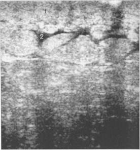Рис. 10.19. Диффузная форма рака молочной железы. 1 — утолщенная кожа; 2 — расширенные подкожные лимфатические сосуды в виде гипо-эхогенных трубчатых структур.