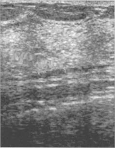 Обычно на одном срезе лоцируются как продольные, так и поперечные фрагменты млечных протоков в виде чередования округлых и линейных гипоэхогенных трубчатых структур (рис. 10.24). Задней границей молочной железы является изображение заднего листка расщепленной фасции в виде параллельной коже гиперэхогенной линии (рис. 10.25). Ретромаммарное пространство располагается между задним листком расщепленной фасции и фасцией большой грудной мышцы. У молодых женщин, а также при отсутствии явлений ожирения ретромаммарная жировая сумка находится в спавшемся состоянии. При этом задний листок расщепленной фасции тесно прилегает к переднему фасциальному футляру большой грудной мышцы (рис. 10.26). У тучных женщин ретромаммарное пространство выполнено жировой клетчаткой и при эхографии между грудными мышцами и паренхимой железы лоцируется гипоэхогенный пласт жировой ткани (рис. 10.27). Грудные и межреберные мышцы визуализируются в виде гипоэхогенных пластов с характерной для мышц исчерченностью (рис. 10.28). Идентификация мышечных пластов является гарантией того, что исследован весь массив молочной железы. Ультразвуковые изображения ребер различны в хрящевой и костной частях. На поперечном изображении хрящевой части ребер визуализируется овальное образование гипоэхоген-ной структуры (рис. 10.29). Латеральные, всегда оссифицированные в норме сегменты ребер визуализируются в виде гиперэхогенных полумесяцев с выраженной акустической тенью (рис. 10.30). Самой глубокой структурой ретромаммарного пространства является плевра, которая определяется в виде светящейся гиперэхогенной линии.