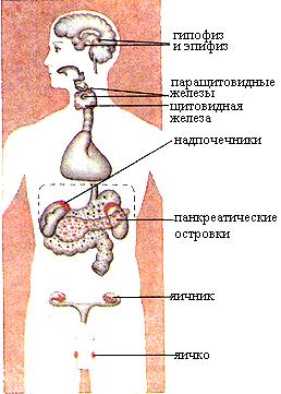 Рис. 6.1. Положение эндокринных желез в теле человека. Вид спереди Классификация эндокринных структур: I. Центральные регуляторные образования эндокринной системы: