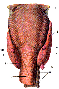 Рис. 6.6. Паращитовидные железы. Вид сзади. 1-средний констриктор (сжиматель) глотки; 2-нижний констриктор глотки; 3-правая верхняя околошитовидная железа; 4-правая доля щитовидной железы; 5-правая нижняя околощитовидная железа; 6-трахея; 7-пищевод; 8-левая нижняя околощитовидная железа; 9-левая доля щитовидной железы. 10-левая верхняя околощитовидная железа.