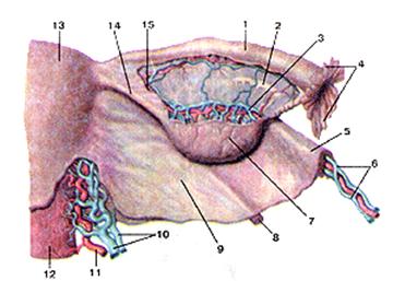 Рис. 6.8. Поджелудочная железа. 1-тело поджелудочной железы; 2-селезеночная артерия; 3-селезе-ночная вена; 4-хвост поджелудочной железы; 5-верхняя брыжеечная артерия. 6-верхняя брыжеечная вена; 7-восходящая часть двенадцатиперстной кишки; 8-нижняя брыжеечная артерия; 9-аорта; 10-крючковидный отросток поджелудочной железы; 11-нижняя (горизонтальная) часть двенадцатиперстной кишки; 12-нижняя поджелудочно-двенадцатиперстная артерия; 13-голо-вка поджелудочной железы; 14-нисходящая часть двенадцатиперстной кишки; 15-верхняя (горизонтальная) часть двенадцатиперстной кишки; 16-верхняя поджелудочно-двенадцатиперстная артерия; 17-пилорический отдел желудка (отрезан); 18-нижняя полая вена; 19-аорта.
