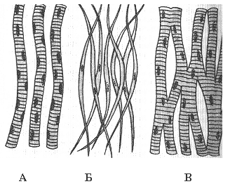 Гладкая мышечная ткань состоит из одноядерных клеток - миоцитов веретеновидной формы длиной 20 – 500 мкм. Их цитоплазма в световом микроскопе выглядит однородно, без поперечной исчерченности. Эта ткань обладает особыми свойствами: она медленно сокращается и расслабляется, обладает автоматией, является непроизвольной (т.е. ее деятельность не управляется по воле человека). Входит в состав стенок внутренних органов: кровеносных и лимфатических сосудов, мочевыводящих путей, пищеварительного тракта. Поперечно-полосатая скелетная мышечная ткань состоит из миоцитов, имеющих большую длину (до нескольких сантиметров) и диаметр около 1 микрона; эти клетки многоядерные, содержат до 100 и более ядер; в световом микроскопе цитоплазма выглядит как чередование темных и светлых полосок. Свойствами этой мышечной ткани является высокая скорость сокращения и расслабления и произвольность (т.е. ее деятельность управляется по воле человека). Эта мышечная ткань входит в состав скелетных мышц, а также в стенку глотки, верхней части пищевода, ею образован язык, глазодвигательные мышцы. Поперечно-полосатая сердечная мышечная ткань состоит из многоядерных кардиомиоцитов, имеющих поперечную исчерченность цитоплазмы. Кардиомиоциты разветвлены и образуют между собой соединения – вставочные диски, в которых объединяется их цитоплазма. Этот вид мышечной ткани образует миокард сердца. Особым свойством этой ткани является автоматия - способность ритмично сокращаться и расслабляться под действием возбуждения, возникающего в самих клетках. Эта ткань является непроизвольной.