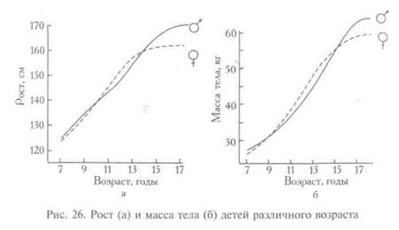 Рост и масса тела Пубертатное ускорение темпа роста (увеличение длины тела в регулярные промежутки времени) у мальчиков и девочек начинается и достигает своего максимума в разном возрасте. У мальчиков обычно скорость роста достигает максимума в 12-17 лет. В возрасте 13 — 15 лет длина тела увеличивается на 20 см (10 — 30 см)-Таким образом, средний максимальный прирост длины тела составляет 10 см в год и соответствует интенсивности роста у двухлетнего мальчика. Длина тела у мальчиков достигает максимума в возрасте 14 лет, в период, предшествующий первой эякуляции (табл. 14). У девочек нарастание длины тела проявляется в возрасте 11" 13,2 года, причем годовое увеличение равно в среднем 8 см. Мак- симума длина тела у девочек достигает к началу менструаций. Из сказанного следует, что в среднем рост и масса тела девушек в возрасте 11 —15 лет больше, чем юношей, и только в более старшем возрасте кривые массы и длины тела мальчиков пересекают кривые у девочек (рис. 25, 26) (см. табл. 14). Таблица 14