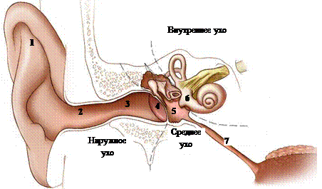 Рисунок 1 – строение преддверно-улиткового органа 1) ушная раковина; 2) наружный слуховой проход (перепончато-хрящевой отдел); 3) наружный слуховой проход (костный отдел); 4) барабанная перепонка; 5) барабанная полость; 6) лабиринт; 7) слуховая труба