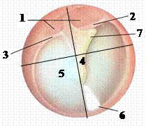 Рисунок 4 – барабанная перепонка 1) ненатянутая часть, pars flaccida; 2) передняя молоточковая складка; 3) задняя молоточковая складка; 4) молоточковая полоска, stria mallearis; 5) натянутая часть, pars tensa; 6) «световой конус»; 7) молоточковый выступ, prominentia mallearis