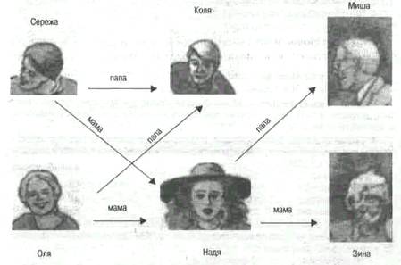 Соответствующая база данных на языке Пролог: мама (Зина, Надя); папа (Миша, Надя); мама (Надя, Оля); папа (Коля, Оля); мама (Надя, Сережа); папа (Коля, Сережа);