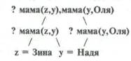 В данном примере общим элементом в выделяемых подвопросах? мама(z,у) и? мама(у,Oля) является переменная «у». Ответом на первый подвопрос? мама(z,у) будут значения z = Зина и у = Надя. Ответы на второй подвопрос? мама(у,0ля) в соответствии с принципом взаимосогласования будет проводиться для значения у = Надя.