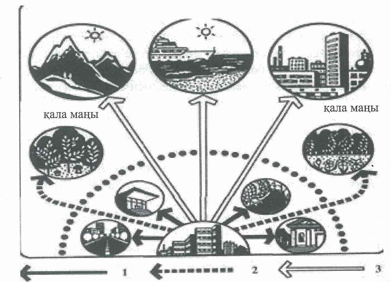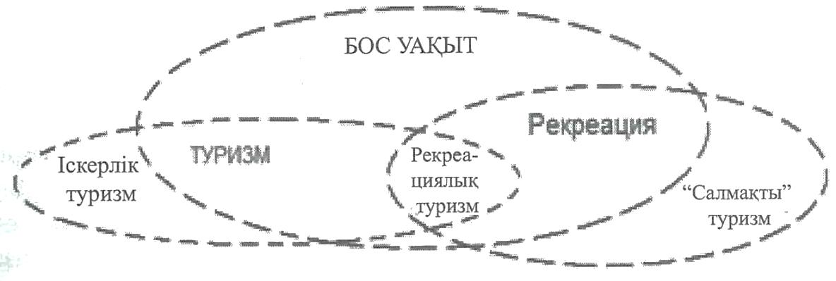 1 - күнделіктідемалыс; 2 - аптасайынғыдемалыс; 3 - жылсайынғыдемалыс 2-сурет. Босуақытмерзімдеріменрекреациялықкеңістіктердітаңдапалуарасындағыұйқастығы (Н. Кючукова, Т. Крыстев, 1972) Туризмнің тұжырымдамалық ұғымын швейцар ғалымдарыВ. УнцикерменК. Крапф, кейінтуризмаясындағығылымисарапшыларыныңхалықаралықассоциациясыберген. Бұлұғымжуйелітетіккенегізделеді. Бұлартуризмдеп«адамдардыңөзмекендейтінжерінентысжердетабыстабумақсатыніздемейсаяхатпенқысқауақытболуларынақатынастықұбылыстарменқатынастаржиынтығын» атаған[7]. Арнайыәдебиеттетуризмбелгілібір «ұғымдаршеңберінде» көрсетіледі. Бұлшеңбергеадамныңүйреншіктіжерінентысжердеболғанкезіндегішараларыкіреді- сауығу, болмыстытану, туған-туысқандарыменжолдас-жораларынабару, іскерлікжәнекәсібишаралардақатысу, мінажатету, емделужәнет. б. Әрине, туризмдіжайшаралартізіміменінектеудұрысемес, дегенмен, осындайанықтаматуризмніңшекараларыншамалауғамүмкіндікбереді. Туризмніңрекреацияның «көлеңкесінен» шығып, өзіндікда-муынабайланысты, туризмменрекреацияныдұрыстапайыруменғылымианықтамаларынтүзетуқажеттілігіпайдаболды. Рекреациясубъектініңерекшебірбиологиялықбелсенділігіболыптабылса (бұлрекреациядаәлеуметтіккомпонентіжоқдегенсөземес, мүлдатекқанаоныңбиологиялықбасымдығыкөрсетіледі), туризмеңалдыменәлеуметтік-экономикалықіс-әрекетсферасыболыпанықталады. Рекреацияғақарағандатуризмәлеуметтікмағынасыбойыншабосуақыткатегориясынажақынырақжәнеоныңэкономикалықкомпонентіөтемаңызды, сондықтантуризмдікейде«босуақытиндустриясы» дептеатайды. Бұлжайтекімаңыздынәрсенібөліпкөрсетеді: біріншісі- халықтың (әсіреседамығанелдерде) босуақытытуризмментолтырылады; екіншіден, туризмадамныңқамынойлайтынэкономиканыңжылдамдамыпкележатқантолыққандыса-ласынаайналды[2]. Туризмніңәлеуметтік-экономикалықмағынасы, оныңкеңауқымы, бұқаралығыжәнемаңызыоны«демалыс», «босуақыт», «рекреация», «туризм» ұғымдарыныңқатарындағыорнынбөліпкөрсетеді. Мағынасымен бірге, туризм мен рекреацияның көлемі де бірдей емес. Рекреация қысқа мерзімді рекреациялық белсенділікті күнделікті өмір шеңберінде қамтиды. Туризм болса осындай әдеттілікті, күнделікті сипатын, қарапайымдықты жоққа шығарады. Осыған орай түрткі жағынан туристік іс-әрекетке ұқсас, бірақ адамдардың үйреншікті ортасында өткізілетін қысқа мерзімді сауықтыру, көңіл көтеру, мәдени-танымдық және т. б. шаралар туризм шеңберіне кірмейді. Тағы бір айырмашылық: қызмет бабындағы саяхаттар (іссапар өтетін жерде табыс табу мақсаты болмаса) туризмнің бір бөлігі болып табылса, адамның кәсіби іс-әрекеттері рекреацияға жатпайды. Дүниежүзілік туристік ұйым (ЮНВТО) іскерлік туризмге съездерге, жиналыстарға, ғылыми конгрестер мен конференцияларға, жәрмеңкелерге, көрмелерге қатысу мақсатында жасалған қызмет са-парларын жатқызады [2]. ЮНВТО - БҰҰ Дүниежүзілік туристік ұйымы, 1975 жылы құрылған. Оған әлемдік туризм индустриясында басты рөл ойнайтын елдер кіреді. Орталығы Испания астанасы Мадридте орналасады. ЮНВТО статистикалық мәліметтердің талдауымен, трендтерді (ұзақ мерзімді тенденцияларды) анықтаумен, мүшелеріне туризмді жоспар-лау мен ұйымдастыруда көмек көрсетумен айналысады (С. Меллик, 1995). Сөйтіп, туристік іс-әрекетәрқашан рекреациялық, ал рекреациялық іс-әрекет туристік іс-әрекетболмай