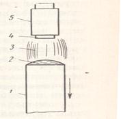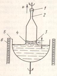 Рисунок Б2.2. Схема выращивания кристалла методом вытягивания из расплава: 1 – затравка, 2 – шейка кристалла, 3 – фронт кристаллизации, 4 – переохлажденная область расплава, 5 – тигель, 6 – нагреватель
