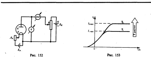 Работа выхода выражается в электрон-вольтах (эВ): 1 эВ равен работе, совершаемой силами поля при перемещении элементарного электрического заряда (заряда, равного заряду электрона) при прохождении им разности потенциалов в 1 В. Так как заряд электрона равен 1,6×10–19 Кл, то 1 эВ= 1,6×10–19 Дж. Работа выхода зависит от химической природы металлов и от чистоты их поверхности и колеблется в пределах нескольких электрон-вольт (например, у калия A = 2,2 эВ, у платины A =6,3 эВ). Подобрав определенным образом покрытие поверхности, можно значительно уменьшить работу выхода. Например, если нанести на поверхность вольфрама (А = 4,5 эВ) слой оксида щелочно-земельного металла (Са, Sr, Ва), то работа выхода снижается до 2 эВ. § 105. Эмиссионные явления и их применение Если сообщить электронам в металлах энергию, необходимую для преодоления работы выхода, то часть электронов может покинуть металл, в результате чего наблюдается явление испускания электронов, или электронной эмиссии. В зависимости от способа сообщения электронам энергии различают термоэлектронную, фотоэлектронную, вторичную электронную и автоэлектронную эмиссии. 1. Термоэлектронная эмиссия — это испускание электронов нагретыми металлами. Концентрация свободных электронов в металлах достаточно высока, поэтому даже при средних температурах вследствие распределения электронов по скоростям (по энергиям) некоторые электроны обладают энергией, достаточной для преодоления потенциального барьера на границе металла. С повышением температуры число электронов, кинетическая энергия теплового движения которых больше работы выхода, растет и явление термоэлектронной эмиссии становится заметным. Исследование закономерностей термоэлектронной эмиссии можно провести с помощью простейшей двухэлектродной лампы — вакуумного диода, представляющего собой откачанный баллон, содержащий два электрода: катод K и анод А. В простейшем случае катодом служит нить из тугоплавкого металла (например, вольфрама), накаливаемая электрическим током. Анод чаще всего имеет форму металлического цилиндра, окружающего катод. Если диод включить в цепь, как это показано на рис. 152, то при накаливании катода и подаче на анод положительного напряжения (относительно катода) в анодной цепи диода возникает ток. Если поменять полярность батареи Б а, то ток прекращается, как бы сильно катод ни накаливали. Следовательно, катод испускает отрицательные частицы — электроны. Если поддерживать температуру накаленного катода постоянной и снять зависимость анодного тока I а от анодного напряжения U а, — вольт-амперную характеристику (рис. 153), то оказывается, что она не является линейной, т. е. для вакуумного диода закон Ома не выполняется. Зависимость термоэлектронного тока I от анодного напряжения в области малых положительных значений U описывается законом трех вторых (установлен русским физиком С. А. Богуславским (1883—1923) и американским физиком И. Ленгмюром (1881—1957)):