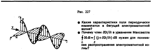 где с = В вакууме (при e =1 и m =l) скорость распространения электромагнитных волн совпадает со скоростью с. Так как em > 1, то скорость распространения электромагнитных воли в веществе всегда меньше, чем в вакууме. При вычислении скорости распространения электромагнитного поля по формуле (162.3) получается результат, достаточно хорошо совпадающий с экспериментальными данными, если учитывать зависимость e и m от частоты. Совпадение же размерного коэффициента в (162.3) со скоростью распространения света в вакууме указывает на глубокую связь между электромагнитными и оптическими явлениями, позволившую Максвеллу создать электромагнитную теорию света, согласно которой свет представляет собой электромагнитные волны. Следствием теории Максвелла является поперечность электромагнитных волн: векторы Е и Н напряженностей электрического и магнитного полей волны взаимно перпендикулярны (на рис. 227 показана моментальная «фотография» плоской электромагнитной волны) и лежат в плоскости, перпендикулярной вектору v скорости распространения волны, причем векторы Е, Н и v образуют правовинтовую систему. Из уравнений Максвелла следует также, что в электромагнитной волне векторы Е и Н всегда колеблются в одинаковых фазах (см. рис. 227), причем мгновенные значения Е и Н в любой точке связаны соотношением