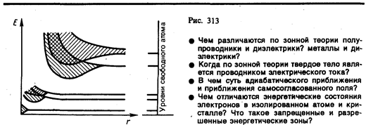 § 241. Металлы, диэлектрики и полупроводники по зонной теории Зонная теория твердых тел позволила с единой точки зрения истолковать существование металлов, диэлектриков и полупроводников, объясняя различие в их электрических свойствах, во-первых, неодинаковым заполнением электронами разрешенных зон и, во-вторых, шириной запрещенных зон. Степень заполнения электронами энергетических уровней в зоне определяется заполнением соответствующих атомных уровней. Если при этом какой-то энергетический уровень полностью заполнен, то образующаяся энергетическая зона также заполнена целиком. В общем случае можно говорить о валентной зоне, которая полностью заполнена электронами и образована из энергетических уровней внутренних электронов свободных атомов, и о зоне проводимости (свободной зоне), которая либо частично заполнена электронами, либо свободна и образована из энергетических уровней внешних «коллективизированных» электронов изолированных атомов. В зависимости от степени заполнения зон электронами и ширины запрещенной зоны возможны четыре случая, изображенные на рис. 314. На рис. 314, а самая верхняя зона, содержащая электроны, заполнена лишь частично, т. е. в ней имеются вакантные уровни. В данном случае электрон, получив сколь угодно малую энергетическую «добавку» (например, за счет теплового движения или электрического поля), сможет перейти на более высокий энергетический уровень той же зоны, т. е. стать свободным и участвовать в проводимости. Внутризонный переход вполне возможен, так как, например, при 1 К энергия теплового движения kT»10–4 эВ, т. е. гораздо больше разности энергий между соседними уровнями зоны (примерно 10–22 эВ). Таким образом, если в твердом теле имеется зона, лишь частично заполненная электронами, то это тело всегда будет проводником электрического тока. Именно это свойственно металлам. Твердое тело является проводником электрического тока и в том случае, когда валентная зона перекрывается свободной зоной, что в конечном счете приводит к не полностью заполненной зоне (рис. 314, б). Это имеет место для щелочноземельных элементов, образующих II группу таблицы Менделеева (Be, Mg, Ca, Zn,...). В данном случае образуется так называемая «гибридная» зона, которая заполняется валентными электронами лишь частично. Следовательно, в данном случае металлические свойства щелочноземельных элементов обусловлены перекрытием валентной и свободной зон. Помимо рассмотренного выше перекрытия зон возможно также перераспределение электронов между зонами, возникающими из уровней различных атомов, которое может привести к тому, что вместо двух частично заполненных зон в кристалле окажутся одна полностью заполненная (валентная) зона и одна свободная зона (зона проводимости). Твердые тела, у которых энергетический спектр электронных состояний состоит только из валентной зоны и зоны проводимости, являются диэлектриками или полупроводниками в зависимости от ширины запрещенной зоны D Е. Если ширина запрещенной зоны кристалла порядка нескольких электрон-вольт, то тепловое движение не может перебросить электроны из валентной зоны в зону проводимости и кристалл является диэлектриком, оставаясь им при всех реальных температурах (рис. 314, в). Если запрещенная зона достаточно узка (D Е порядка 1 эВ), то переброс электронов из валентной з
