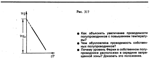 где g 0 — постоянная, характерная для данного полупроводника. Увеличение проводимости полупроводников с повышением температуры является их характерной особенностью (у металлов с повышением температуры проводимость уменьшается). С точки зрения зонной теории это обстоятельство объяснить довольно просто: с повышением температуры растет число электронов, которые вследствие теплового возбуждения переходят в зону проводимости и участвуют в проводимости. Поэтому удельная проводимость собственных полупроводников с повышением температуры растет. Если представить зависимость ln g от 1/ T, то для собственных полупроводников — это прямая (рис. 317), по наклону которой можно определить ширину запрещенной зоны D Е, а по ее продолжению — g 0 (прямая отсекает на оси ординат отрезок, равный ln g 0).