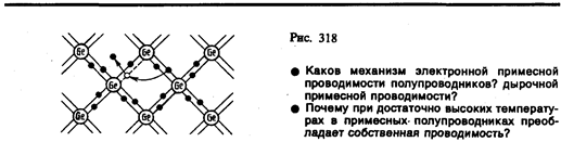 Одним из наиболее широко распространенных полупроводниковых элементов является германий, имеющий решетку типа алмаза, в которой каждый атом связан ковалентными связями (см. § 71) с четырьмя ближайшими соседями. Упрощенная плоская схема расположения атомов в кристалле Ge дана на рис. 318, где каждая черточка обозначает связь, осуществляемую одним электроном. В идеальном кристалле при 0 К такая структура представляет собой диэлектрик, так как все валентные электроны участвуют в образовании связей и, следовательно, не участвуют в проводимости. При повышении температуры (или под действием других внешних факторов) тепловые колебания решетки могут привести к разрыву некоторых валентных связей, в результате чего часть электронов отщепляется и они становятся свободными. В покинутом электроном месте возникает дырка (она изображена белым кружком), заполнить которую могут электроны из соседней пары. В результате дырка, так же как и освободившийся электрон, будет двигаться по кристаллу. Движение электронов проводимости и дырок в отсутствие электрического поля является хаотическим. Если же на кристалл наложить электрическое поле, то электроны начнут двигаться против поля, дырки— по полю, что приведет к возникновению собственной проводимости германия, обусловленной как электронами, так и дырками. В полупроводниках наряду с процессом генерации электронов и дырок идет процесс рекомбинации: электроны переходят из зоны проводимости в валентную зону, отдавая энергию решетке и испуская кванты электромагнитного излучения. В результате для каждой температуры устанавливается определенная равновесная концентрация электронов и дырок, изменяющаяся с температурой согласно выражению (242.4).