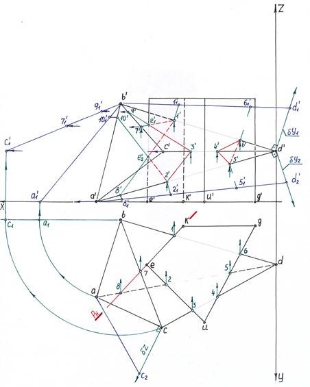 1. Строим проекции пирамиды и призмы. 2. На горизонтальной плоскости проекций Н отмечаем характерные точки пересечения ребер пирамиды с гранями призмы (1, 2, 3, 4, 5, 7) 3. Находим фронтальные проекции данных точек на соответствующих ребрах пирамиды (1', 2', 3', 4', 5', 7'). Например, точки 7 и 2 лежат на ребре bd, значит точки 7' и 2' строим на ребре b'd'. 4. Определяем ребра призмы, проходящие через “тело пирамиды” (ребро Е) на плоскости Н. 5. Проводим вспомогательную прямую из точки d через точку e и находим две вспомогательные точки: одна на ребре bc, вторая на ребре ba. В точке e отмечаем точки 6, 8. 6. Строим вторые проекции вспомогательных точек на b'c' и b'a', соединяем эти точки с вершиной d', при прохождении через призму они пересекут ребро e/, отмечаем точки 6', 8'. 7. Соединяем между собой точки, лежащие на одной грани пирамиды, например: b' c' d' – точки 2', 3', 5', 7'; a'c'd' – точки 1', 3', 4', 5'; a'b'd' – точки 1', 2', 4', 7'; a'b'c' – точек нет. Точки соединяем, перемещаясь вдоль граней призмы (смотрим на плоскости Н): в b'c'd' – точки 2', 3', 5', 6', 7'; a'c'd' точки 1', 3'; 4', 5'; в a'b'd' – точки 1', 2’; 4', 8', 7' соединяли по граням gu, ke и eu. 8. Определяем видимость линии пересечения: если грань пирамиды и грань призмы видимые, то и линия их взаимного пересечения будет видимой, если хотя бы одна из граней фигуры будет невидимой, то и линия будет невидимой. В данном случае грань a'b'd' невидимая, соответственно и линии на ней невидимые. Грань k'e' тоже невидимая, следовательно, линия 6'7' – невидимая. 9. Видимость ребер пирамиды и призмы определяется из видимости грани, с которой пересекается ребро. Если ребро пересекает видимую грань, то оно будет видимым, если ребро пересекает невидимую грань, то, соответственно, ребро будет невидимым. Например, ребро b'd' пересекает грань к'е' в точке 1' и пересекает грань u'g' в точке 6', так как грань к'е' невидимая, то ребро b'1' будет невидимым за призмой (до призмы будет видимым) и часть ребра 6'd' будет видимой, так как грань u'g' – видимая.