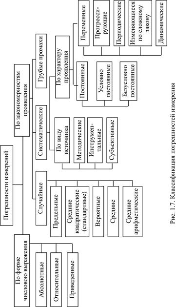 При практическом использовании тех или иных измерений важно оценить их точность. Термин «точность измерений», т.е. степень приближения результатов измерения к некоторому действительному значению, не имеет строгого определения и используется для качественного сравнения измерительных операций. Для количественной оценки используется понятие «погрешность измерений» (чем меньше погрешность, тем выше точность). Оценка погрешности измерений – одно из важных мероприятий по обеспечению единства измерений. Количество факторов, влияющих на точность измерения, достаточно велико, и любая классификация погрешностей измерения (рис. 1.7) в известной мере условна, так как различные погрешности в зависимости от условий измерительного процесса проявляются в различных группах. Поэтому для практических целей достаточно рассмот-