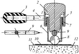 В данном случае практически исключается влияние силы удара на результаты измерения, поскольку при ее изменении изменяются d б и d э, а их соотношение должно оставаться постоянным. Однако такое положение будет справедливым только в том случае, когда испытуемая конструкция и эталонный стержень изготовлены из одного материала, как, например, в приборе Польди для определения твердости стали. В молотке Кашкарова в качестве эталонного стержня применяется круглая сталь марки ВстЗпс диаметром 10 мм, а испытуемый материал является бетоном. Скорость нарастания пластических деформаций при ударе у этих материалов будет различная, поэтому полностью исключить влияние изменения силы удара на результаты измерения не удается, но оно будет в значительной степени меньше, чем у молотка Физделя. Конструкция молотка приведена на рис. 5.12. Поверхность эталонного стержня не должна подвергаться механической обработке, т.к. при этом увеличится твердость стали по сравнению с эталоном, который применялся при построении графика. При испытании молоток устанавливают перпендикулярно к поверхности бетона и ударяют другим слесарным молотком по наковальне. Всего наносят на одном участке не менее 5 ударов, при этом расстояние между отпечатками должно быть не ближе 30 мм друг от друга и от края конструкции. После каждого удара эталонный стержень передвигают, чтобы расстояние между центрами соседних отпечатков было не менее 10 мм.