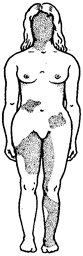 Рис. 3.79. Мозаицизм женского организма по наличию или отсутствию нормальных потовых желез в коже, обусловленный экспрессией нормального или мутантного аллелей гена Х-хромосомы