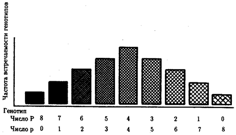 Рис. 3.80. Зависимость интенсивности пигментации кожи у человека от количества доминантных аллелей в системе полигенов (Р) в генотипе