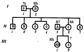 Рис. 3.82. Родословная, иллюстрирующая наследование группы крови по системе АВО при бомбейском феномене