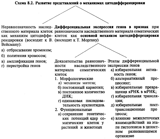 Можно выделить целый ряд признаков, которые характеризуют степень дифференцированности клеток. Так, для недифференцированного состояния характерны относительно крупное ядро и высокое ядерно-цитоплазматическое отношение Vядра/Vцитоплазмы (V— объем), диспергированный хроматин и хорошо выраженное ядрышко, многочисленные рибосомы и интенсивный синтез РНК, высокая митотическая активность и неспецифический метаболизм. Все эти признаки изменяются в процессе дифференцировки, характеризуя приобретение клеткой специализации. Процесс, в результате которого отдельные ткани в ходе дифференцировки приобретают характерный для них вид, называют гистогенезом. Дифференцировка клеток, гистогенез и органогенез совершаются в совокупности, причем в определенных участках зародыша и в определенное время. Это очень важно, потому что указывает на координированность и интегрированность эмбрионального развития. В то же время удивительно, что, в сущности, с момента одноклеточной стадии (зиготы) развитие из нее организма определенного вида уже жестко предопределено. Всем известно, что из яйца птицы развивается птица, а из яйца лягушки —лягушка. Правда, фенотипы организмов всегда различаются и могут быть нарушены до степени гибели или возникновения порока развития, а нередко могут быть даже как бы искусственно сконструированы, например у химерных животных. Требуется понять, каким образом клетки, обладающие чаще всего одинаковыми кариотипом и генотипом, дифференцируются и участвуют в гисто- и органогенезе в необходимых местах и в определенные сроки соответственно целостному «образу» данного вида организмов. Осторожность при выдвижении положения о том, что наследственный материал всех соматических клеток абсолютно идентичен, отражает объективную реальность и историческую неоднозначность в трактовке причин клеточной дифференцировки. В. Вейсман выдвинул гипотезу о том, что только линия половых клеток несет в себе и передает потомкам всю информацию своего генома, а соматические клетки могут отличаться от зиготы и друг от друга количеством наследственного материала и поэтому дифференцироваться в разных направлениях. Ниже приведены факты, подтверждающие возможность изменения наследственного материала в соматических клетках, но их надо трактовать как исключения из правил. Вейсман опирался на данные о том, что в ходе первых делений дробления яиц лошадиной аскариды происходит отбрасывание (элиминация) части хромосом в соматических клетках эмбриона. В дальнейшем было показано, что отбрасываемая ДНК содержит главным образом часто повторяющиеся последовательности, т.е. фактически не несущие информации. Развитие представлений о механизмах цитодифференцировки изображено на схеме 8.2.