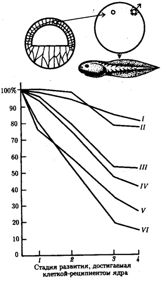 Рис. 8.7. Зависимость успеха пересадки ядер из дифференцированной клетки в яйцеклетку от возраста донора (I—VI) ядра: I —бластула, II —гаструла, III —нейрула, IV— появление мышечной реакции, V— начало сердечной деятельности и вылупления, VI— активное плавание; 1 —ранняя гаструла, 2—нейрула, 3— плавающий головастик, 4— питающийся головастик; вверху изображена схема опыта В большинстве случаев развитие останавливалось на более ранних стадиях. Зависимость результатов пересадки от стадии зародыша-донора ядер представлена на рис. 8.7. Анализ зародышей, останавливающихся в развитии после пересадки ядра, показал множество хромосомных аномалий в их ядрах. Другой причиной остановки развития считают неспособность ядер дифференцированных клеток к восстановлению синхронной репликации ДНК. Главный вывод, который вытекает из этого опыта, заключается в том, что наследственный материал соматических клеток способен сохраняться полноценным не только в количественном, но и в функциональном отношении, цитодифференцировка не является следствием недостаточности наследственного материала. Самым последним достижением в этой области является получение овечки Долли. Ученые не исключают возможности воспроизведения подобным же образом, т.е. путем пересадки ядер, генетических двойников человека. Следует однако отдавать себе отчет, что клонирование человека кроме научно-технологического имеет также этический и психологический аспекты. Гипотеза дифференциальной экспрессии генов в признак принимается в настоящее время в качестве основного механизма цитодифференцировки. Общие принципы регуляции экспресии генов изложены в гл. 3.6.6. В данной главе делается попытка выяснить механизмы регуляции избирательной проявляемости генов в признак применительно к развивающемуся многоклеточному организму, у которого судьбы отдельных групп клеток неотрывны от пространственно-временных аспектов индивидуального развития. Уровни регуляции дифференциальной экспрессии генов соответствуют этапам реализации информации в направлении ген → полипептид → признак и включают не только внутриклеточные процессы, но тканевые и организменные. Экспрессия гена в признак — это сложный этапный процесс, который можно изучать разными методами: электронной и световой микроскопией, биохимически и другими. На схеме 8.3 приведены основные этапы экспрессии генов и методы, с помощью которых их можно изучать. Схема 8.3