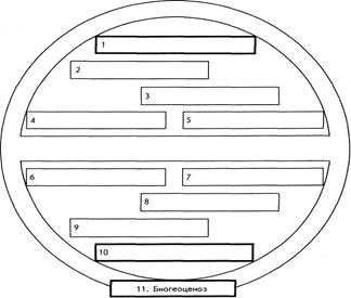 Академик В.Н.Сукачев ұсынған биогеоценоздың «соқыр» моделінің сызбасы. Бастапқы моделін жасақтау үшін бос ұяшықтарға төменде берілген биогеоценоз компоненттерін толтырыңыздар. Ұсынылған түсініктердің бағыныштылығын дәлелдеңіздер: - атмосфера; - өсімдіктер жамылғысы; - топырақ қабаты; - гидрологиялық жағдайлар; - экотоп (қосымша, биогеоценоздың өлі компоненттері); - биоценоз; - тау жыныстары; - жануарлар әлемі (зооценоз); - саңырауқұлақтар (микоценоз); - микроағзалар(микробиоценоз); Бақылау сұрақтары: 1.Экожүйе түсінігі. 2.Экожүйедегі зат айналым 3.Экожүйенің қоректік құрылымы 4. Экожүйелердің өнімділігі, Алғашқы және екінші реттік өнімділік 5.Экологиялық пирамидалар. Сандар, биомасса және энергия пирамаидалары 6.Экологиялық сукцессиялар. Бірінші реттік және екінші реттік сукцессиялар Әдістемелік нұсқаулар: Тақырыпты оқу кезінде төменгі ағзалық жүйе жөніндегі сұрақ негізгі орын алады. Студенттер экожүйелердің сипаттамасын, анықтамасын, экожүйедегі заттар айналымы және қуат ағынын, қоректік тізбектерді жақсы білулері керек. Қоректік тізбектермен танысу кез-келген экожүйенің құрамдас бөліктері мен құрылымын анықтауға мүмкіндік береді. Оқытушы орманда мекен ететін өсімдіктер мен жануарлар, саңырауқұлақтар түрлерін атап, олардың экожүйе патшалығында алатын орнын атауды сұрайды. Өсімдіктер, саңырауқұлақтар, бактериялар, микроағзалар, жануарлардың ролін талдау студенттерге экожүйе тіршілігі үшін заттар айналымы қажет екенін, ол олардың органикалық заттарды өндірушілер - өсімдіктер арқылы болатыны, органикалық заттарды тұтынушылар – жануарлар арқылы, органикалық заттарды ыдыратушылар - микроағзалар арқылы жүретіні белгілі. Оқытушы студенттерге экожүйе суреті бейнеленген кестені көрсетіп ондағы қоректік тізбектерді атауды сұрайды. Практикалық сабақ 7 Тақырыбы Биосфера және оның тұрақтылығы Сабақ тақырыбы: Биосфера және оның тұрақтылығы Сабақ мақсаты: Студенттерді биосфера түсінігімен, биосфера және ноосфера жайлы іліммен, биосфера эволюциясы және компоненттерімен таныстыру. Оқыту құралдары мен әдістері: бейнелеу, сызбанұсқаны талқылау, ауызша сұрау, имитациялық және іскерлік ойындар, презентация және т.б.