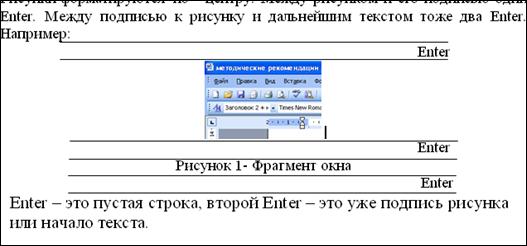 Рисунки форматируются по центру. Между рисунком и его подписью два Enter. Между подписью к рисунку и дальнейшим текстом тоже два Enter. Enter – это пустая строка, второй Enter – это уже подпись рисунка или начало текста. Его название размещается под рисунком. Например: