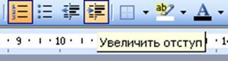 В дальнейшем при нажатии клавиши Enter вновь появится обозначение первого уровня списка (т.е. дефис). Чтобы перейти ко второму уровню списка надо увеличить отступ, воспользовавшись кнопкой на панели инструментов Форматирование: