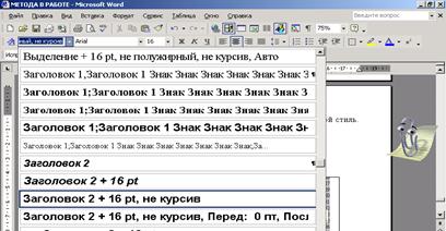 . Чтобы установить стиль, необходимо выделить текст заголовка и на панели ФОРМАТИРОВАНИЕ открыть окно СТИЛЬ (рис.2), где выбрать желаемый стиль заголовкам (заголовок 1; заголовок 2 и т. д.). Подзаголовкам присваивается другой стиль (заголовок 2; заголовок 3 и т. д.).