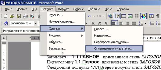 По окончании работы нужно перейти к созданию самого оглавления (рис.4). Для этого откройте меню ВСТАВКА (рис.3), выберите команду ссылка, в открывшемся дополнительном меню выберите команду ОГЛАВЛЕНИЕ И УКАЗАТЕЛИ (рис.5).