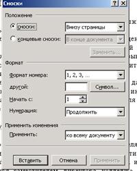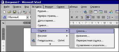Вставка сноски производится из меню ВСТАВКА (рис.7). В открывшемся диалоговом окне (рис. 8) ССЫЛКА - СНОСКА.