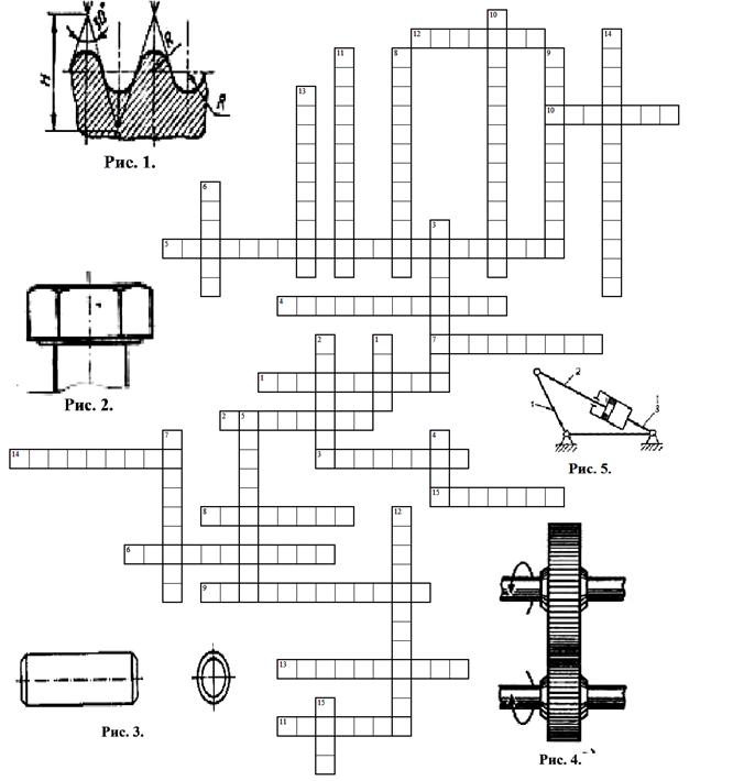 По горизонтали: 1. Какие подшипники - это опоры вращающихся деталей, работающие в условиях относительного скольжения поверхности цапфы по поверхности подшипника, разделенных слоем смазки? 2. Как называется звено, имеющее общую кинематическую пару со стойкой и совершающее полный оборот вокруг своей оси? 3. Как называют фрикционный механизм, предназначенный для бесступенчатого регулирования передаточного числа? 4. Какие ремни в ременных передачах специального назначения находят применение? 5. Какой подшипник скольжения имеет шаровую опорную поверхность? 6. Достоинство червячной передачи? 7. Каждая из взаимокасающихся окружностей зубчатых колес передачи, принадлежащая начальной поверхности данного зубчатого колеса - это _______ окружность? 8. Какой механизм изображен на рисунке 5? 9. Метод изготовления зубьев на валу? 10. Какая резьба представлена на рисунке 1? 11. Какая сварка применяется в основном там, где нет источников электроэнергии, например, при ремонте в полевых условиях? 12. Причина разрушения заклепочного шва во время работы? 13. Они делятся на две группы в зависимости от вида трения в них: а) качения; б) скольжения? 14. Назовите вид соединения коленчатого вала двигателя с шатуном? 15. Как называется прибор, техническое устройство, приспособление, обычно некая автономно-функциональная часть более сложной системы? По вертикали: 1. Разновидность разрушения зуба? 2. Автор формулы: W= 6n- 1P1-2P2-3P3-4P4-5P5+q? 3. Вид цепной передачи? 4. Материал плоскоременных передач? 5. Какие подшипники скольжения предназначены для восприятия радиальной нагрузки? 6. Вид вала по геометрической форме? 7. Какое требование при конструировании колеса является наиболее важным? 8. Способ отделки зубьев? 9. Какая передача показана на рисунке 4? 10. Какой штифт изображен на рисунке 3? 11. Какая сталь применяется для изготовления шпонок для нагруженных соединений? 12. На рисунке 2 показан болт, с какой головкой? 13. Как называется сварка, когда металл в зоне сварки нагревается плазмой до расплавления с образованием сварочной ванны? 14. Какие машины - это устройства, предназначенные для преобразования энергии любого вида (электрической, паровой, тепловой и т.п.) в механическую? 15. Как называется законченная сборочная единица, состоящая из деталей общего функционального назначения и выполняющая определенную функцию в изделиях одного назначения только совместно с другими составными частями изделия?
